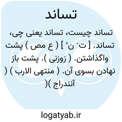 تساند. [ ت َ ن ُ ] ( ع مص ) پشت واگذاشتن. ( زوزنی ). پشت باز نهادن بسوی آن. ( منتهی الارب ) ( آنندراج )( ناظم الاطباء ) ( از متن اللغة ). اعتماد کردن بر آن. ( از اقرب الموارد ) ( از المنجد ). || یاری دادن یکدیگر را تحت رایات مختلف نه آنکه جمع گردند در زیر رایت امیر واحدی. ( از متن اللغة ): حرج القوم متساندین علی رایات شتی؛ لم یکونوا تحت رایة امیر واحد. ( منتهی الارب ) ( ناظم الاطباء ). || همدیگر را غالب کردن. ( منتهی الارب ) ( آنندراج ) ( ناظم الاطباء ).