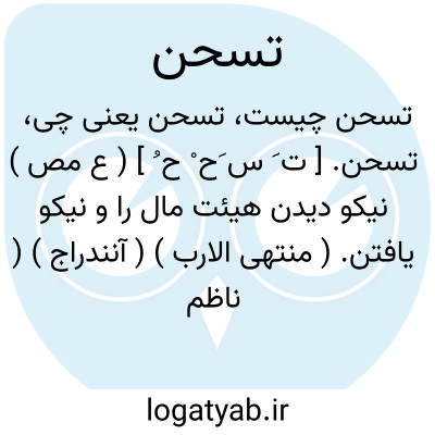 تسحن. [ ت َ س َح ْ ح ُ ] ( ع مص ) نیکو دیدن هیئت مال را و نیکو یافتن. ( منتهی الارب ) ( آنندراج ) ( ناظم الاطباء ). نگریستن به هیئت و رنگ ونهاد مال. ( از اقرب الموارد ) ( از متن اللغة ) ( از المنجد ): تسحن المال؛ نظر الی سَحَنائِه. ( متن اللغة ).