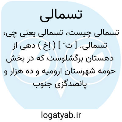 تسمالی. [ ت َ ] ( اِخ ) دهی از دهستان برگشلوست که در بخش حومه شهرستان ارومیه و ده هزار و پانصدگزی جنوب خاوری ارومیه و سه هزار و پانصدگزی شمال خاوری شوسه ارومیه به مهاباد واقع است. جلگه ای معتدل است و 130 تن سکنه دارد. آب آن ازشهر چای و محصول آنجا غله و توتون و انگور و چغندر و حبوبات است. شغل مردم زراعت است و راه ارابه رو و پنج باب دکان دارد. ( از فرهنگ جغرافیایی ایران ج 4 ).