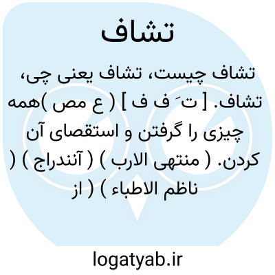 تشاف. [ ت َ ف ف ] ( ع مص )همه چیزی را گرفتن و استقصای آن کردن. ( منتهی الارب ) ( آنندراج ) ( ناظم الاطباء ) ( از متن اللغة ) ( از اقرب الموارد ) ( از المنجد ). || خوردن همه باقی آب را. ( منتهی الارب ) ( آنندراج ) ( ناظم الاطباء ). آشامیدن همه آنچه را که در خنور است. ( اقرب الموارد ). || بردن فضل و فزونی چیزی را. ( منتهی الارب ) ( ناظم الاطباء ) ( از متن اللغة ) ( از اقرب الموارد ) ( از المنجد ). و در مثل گویند: «لیس الری من التشاف » و تشاف آن است که بیاشامد همه آنچه که در خنور است. مأخوذ است از شفافة و آن مانده است و معنی مثل این است ت که «لیس من لایشتف لایروی » یعنی نه هر که همه آنچه را که در خنور است نیاشامد، سیراب نگردد. چه گاه سیراب شدن بکم از این نیز دست دهد و این مثال را بخاطر قناعت کردن مرد آرند هر گاه به پاره ای از حاجت خود برسد، یعنی چنان نیست که حاجت تو آنگاه روا گردد که به همه آنچه خواهی برسی، بلکه هرگاه نصیب بیشتری از آن یافتی به آن قناعت کن. ( مجمع الامثال ). و در اقرب الموارد و المنجد مثال به نحو دیگری معنی شده است.