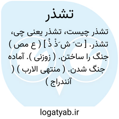 تشذر. [ ت َ ش َذْ ذُ ] ( ع مص ) جنگ را ساختن. ( زوزنی ). آماده جنگ شدن. ( منتهی الارب ) ( آنندراج ) ( ناظم الاطباء ). مهیا شدن برای قتال و حمله. ( از اقرب الموارد ). || شادمان شدن. || سرعت نمودن بسوی کاری. || جنبیدن. || کج شدن تازیانه. || پریشان و متفرق شدن قوم. ( منتهی الارب ) ( آنندراج ) ( ناظم الاطباء ) ( از اقرب الموارد ). || از حد درگذشتن در جنگ. ( منتهی الارب ) ( آنندراج ) ( ناظم الاطباء ). تطاول قوم در جنگ. ( از اقرب الموارد ). || دامن به میان پای گرفتن. ( منتهی الارب ) ( آنندراج ) ( ناظم الاطباء ). استثفار. ( اقرب الموارد ). || بیم کردن. ( منتهی الارب ) ( آنندراج ) ( ناظم الاطباء ). توعد. ( اقرب الموارد ). || تهدید نمودن. || خشم گرفتن. ( منتهی الارب ) ( آنندراج ) ( ناظم الاطباء ). تغضب. ( اقرب الموارد ). || سر جنبانیدن شتر ماده از نشاط به دیدن علف. || از پس برنشستن ستور را. ( منتهی الارب ) ( آنندراج ) ( ناظم الاطباء ) ( از اقرب الموارد ).