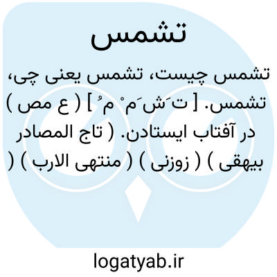 تشمس. [ ت َش َم ْ م ُ ] ( ع مص ) در آفتاب ایستادن. ( تاج المصادر بیهقی ) ( زوزنی ) ( منتهی الارب ) ( آنندراج ) ( ناظم الاطباء ). در آفتاب نشستن و ایستادن. ( از اقرب الموارد ). || بخل ورزیدن بر کسی. ( از اقرب الموارد ).