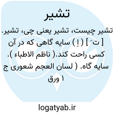 تشیر. [ ت َ ] ( اِ ) سایه گاهی که در آن کسی راحت کند.( ناظم الاطباء ). سایه گاه. ( لسان العجم شعوری ج 1 ورق 277 الف ). سایه گاهی برای استراحت. ( از اشتینگاس ).