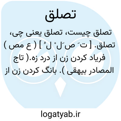 تصلق. [ ت َ ص َل ْ ل ُ ] ( ع مص ) فریاد کردن زن از درد زه.( تاج المصادر بیهقی ). بانگ کردن زن از درد زه. ( منتهی الارب ) ( آنندراج ) ( ناظم الاطباء ) ( از اقرب الموارد ). || در خاک غلطیدن ستور و جز آن از مشقت و اندوه. ( منتهی الارب ) ( آنندراج ) ( ناظم الاطباء ) ( از اقرب الموارد ). || پهلو به پهلو شدن هر دردمند از درد. ( از اقرب الموارد ) ( آنندراج ). || آمد و شد در آب. ( منتهی الارب ) ( ناظم الاطباء ). گردیدن و تاب خوردن ماهی در آب. ( از اقرب الموارد ).