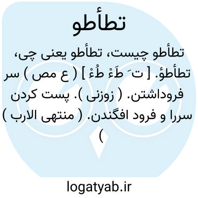 تطأطؤ. [ ت َ طَءْ طُءْ ] ( ع مص ) سر فروداشتن. ( زوزنی ). پست کردن سررا و فرود افگندن. ( منتهی الارب ) ( آنندراج ) ( ناظم الاطباء ) ( از اقرب الموارد ): تطأطأت لهم تطأطؤ الدلاة؛ ای خفضت لهم نفسی کتطأمن الدلاة. و دلاة جمع دال است و آن از دلو گرفته شده است. ( از اقرب الموارد ).