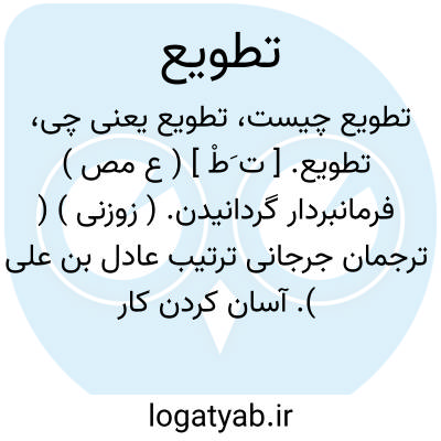 تطویع. [ ت َطْ ] ( ع مص ) فرمانبردار گردانیدن. ( زوزنی ) ( ترجمان جرجانی ترتیب عادل بن علی ). آسان کردن کار بر کسی و توانا کردن بر کاری. منه قوله تعالی: فطوعت له نفسه قتل اخیه ( قرآن 5 / 30 )؛ یعنی آسان کرد و توانا نمود و یا پیرو او گشت و فرمانبرداری نمود و یادلیر کرد او را و اعانت کرد و پذیرفت حکم وی را. ( منتهی الارب ) ( ناظم الاطباء ) ( از اقرب الموارد ). آسان کردن کاری را و توانا کردن کسی را بر کاری. ( آنندراج ). || سزاوار گردانیدن چیزی را. ( زوزنی ).