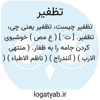 تظفیر. [ ت َ ] ( ع مص ) خوشبوی کردن جامه را به ظفار. ( منتهی الارب ) ( آنندراج ) ( ناظم الاطباء ) ( از اقرب الموارد ). || پیروزی دادن و پیروزمند ساختن. ( منتهی الارب ) ( آنندراج ) ( ناظم الاطباء ). پیروز گردانیدن خداوند کسی را بر دشمن وی. ( از اقرب الموارد ). || ظفرک اﷲ گفتن کسی را. ( منتهی الارب ) ( آنندراج ) ( ناظم الاطباء ). دعا کردن کسی را به پیروزی. ( از اقرب الموارد ). || ناخن فروبردن در چیزی. ( منتهی الارب ) ( آنندراج ) ( ناظم الاطباء ). فروبردن ناخن در روی کسی. فروکردن ناخن در سیب و مانند آن. ( از اقرب الموارد ). || بقدر ناخن برآمدن عرفج. ( منتهی الارب ) ( آنندراج ) ( ناظم الاطباء ) ( از اقرب الموارد ). || برآوردن زمین گیاه را چندان که به انگشت کنده شود. ( منتهی الارب ) ( آنندراج ) ( ناظم الاطباء ) ( از اقرب الموارد ). || مالیدن پوست را تا اظفار آن تابان گردد. ( منتهی الارب ) ( آنندراج ) ( ناظم الاطباء ). مالیدن و نرم و تابان کردن پوست. ( از اقرب الموارد ).