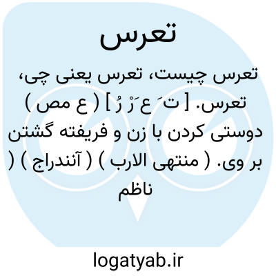 تعرس. [ ت َ ع َرْ رُ ] ( ع مص ) دوستی کردن با زن و فریفته گشتن بر وی. ( منتهی الارب ) ( آنندراج ) ( ناظم الاطباء ). دوستی کردن با زن. ( از اقرب الموارد ).