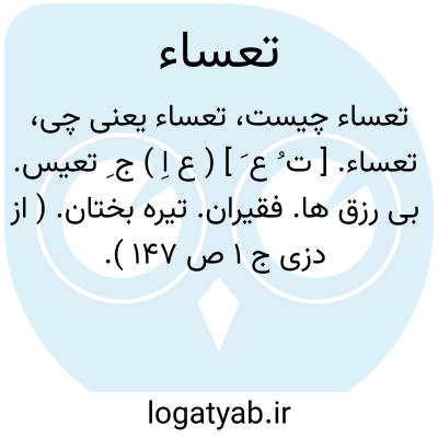 لغت نامه دهخدا تعساء. [ ت ُ ع َ ] ( ع اِ ) ج ِ تعیس. بی رزق ها. فقیران. تیره بختان. ( از دزی ج 1 ص 147 ).