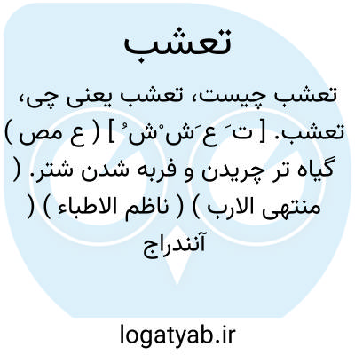 لغت نامه دهخدا تعشب. [ ت َ ع َش ْش ُ ] ( ع مص ) گیاه تر چریدن و فربه شدن شتر. ( منتهی الارب ) ( ناظم الاطباء ) ( آنندراج ) ( از اقرب الموارد ).