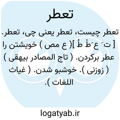 تعطر. [ ت َ ع َطْ طُ ]( ع مص ) خویشتن را عطر برکردن. ( تاج المصادر بیهقی ) ( زوزنی ). خوشبو شدن. ( غیاث اللغات ). خوشبو شدن و عطرآلودن خود را. ( منتهی الارب ) ( آنندراج ) ( ناظم الاطباء ) ( از اقرب الموارد ). || اقامت نمودن زن بخانه مادر و پدر خود و نکاح ناکردن و منه الحدیث کان صلی اﷲ علیه و سلم: یکره تعطر النساء و تشبههن بالرجال؛ ای تطلهن من خلی و الخضاب ابدال الراء باللام اواراد عطراً یظهر ریحه کما یظهر عطر الرجال. ( منتهی الارب ) ( آنندراج ) ( ناظم الاطباء ) ( از اقرب الموارد ).
