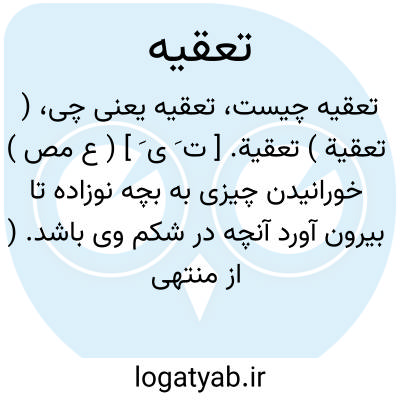 ( تعقیة ) تعقیة. [ ت َ ی َ ] ( ع مص ) خورانیدن چیزی به بچه نوزاده تا بیرون آورد آنچه در شکم وی باشد. ( از منتهی الارب ) ( ناظم الاطباء ) ( از اقرب الموارد ). || تیر به هوا درانداختن. ( تاج المصادر بیهقی ). انداختن تیر در هوا. ( منتهی الارب ) ( ناظم الاطباء ) ( از اقرب الموارد ). || دور برشدن مرغ در پریدن. ( تاج المصادر بیهقی ). بلند پریدن مرغ. ( منتهی الارب ) ( ناظم الاطباء ) ( از اقرب الموارد ).