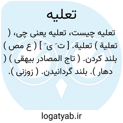 ( تعلیة ) تعلیة. [ ت َ ی َ ] ( ع مص ) بلند کردن. ( تاج المصادر بیهقی ) ( دهار ). بلند گردانیدن. ( زوزنی ). بلند و بزرگ ساختن. || برآمدن بر چیزی. || فرود آوردن بار از ستور. || سرنامه نوشتن کتاب را. ( منتهی الارب ) ( ناظم الاطباء ) ( از اقرب الموارد ). || و یقال: علیت الحبل؛ ای رفعته الی وضعه من البکرة. ( منتهی الارب ) ( ناظم الاطباء ).