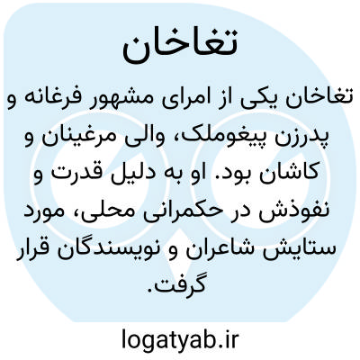 طغاخان یکی از امرای مشهور فرغانه و پدرزن پیغوملک، والی مرغینان و کاشان بود. او به دلیل قدرت و نفوذش در حکمرانی محلی، مورد ستایش شاعران و نویسندگان قرار گرفت و در آثار ادبی آن زمان، از جمله لباب الالباب عوفی، قصایدی در مدح او ثبت شده است. به عنوان نمونه، شعری که در مدح طغاخان درج شده، به قدرت فرمان و تسلط او بر ملک‌ها اشاره دارد و نشان‌دهنده جایگاه بالای او در ساختار حکومتی منطقه است.