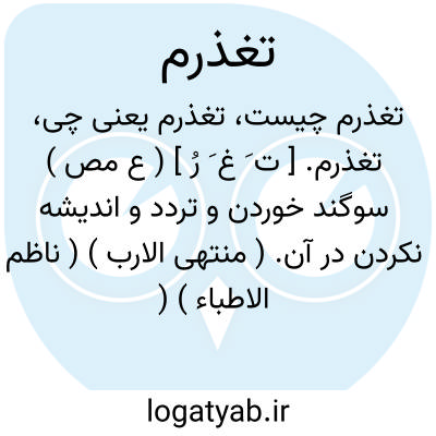 تغذرم. [ ت َ غ َ رُ ] ( ع مص ) سوگند خوردن و تردد و اندیشه نکردن در آن. ( منتهی الارب ) ( ناظم الاطباء ) ( از اقرب الموارد ).