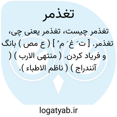 تغذمر. [ ت َ غ َ م ُ ] ( ع مص ) بانگ و فریاد کردن. ( منتهی الارب ) ( آنندراج ) ( ناظم الاطباء ). بانگ و فریاد کردن در مجلس و فی حدیث علی ( ع ): قاموا و لهم تغذمر و بربرة. ( از اقرب الموارد ). || درآمیختن کلام را. ( منتهی الارب ) ( آنندراج ) ( ناظم الاطباء ). و تغذمر الغضب و سوءاللفظ و التخلیط فی الکلام و کذا البربرة. ( اللسان از اقرب الموارد ).