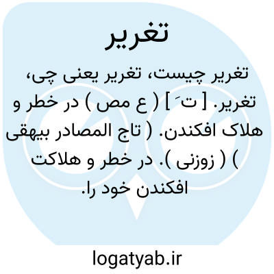 تغریر. [ ت َ ] ( ع مص ) در خطر و هلاک افکندن. ( تاج المصادر بیهقی ) ( زوزنی ). در خطر و هلاکت افکندن خود را. ( منتهی الارب ) ( ناظم الاطباء ). نفس و مال خود را به هلاکت افکندن. ( از اقرب الموارد ). مغرور کردن خود راو نفس را هلاک ساختن. ( آنندراج ). || پر کردن مشک را. ( منتهی الارب ) ( آنندراج ) ( ناظم الاطباء ) ( از اقرب الموارد ). || آهنگ پریدن کردن مرغ و بازو گشادن آن. ( منتهی الارب ) ( ناظم الاطباء ) ( از اقرب الموارد ) ( از آنندراج ). || برآمدن دندان کودک، یقال: غررت ثنیة الغلام؛ ای طلعت. ( منتهی الارب ) ( ناظم الاطباء ) ( از آنندراج ) ( از اقرب الموارد ).