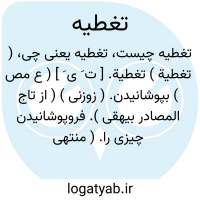 ( تغطیة ) تغطیة. [ ت َ ی َ ] ( ع مص ) بپوشانیدن. ( زوزنی ) ( از تاج المصادر بیهقی ). فروپوشانیدن چیزی را. ( منتهی الارب ) ( آنندراج ) ( از ناظم الاطباء ) ( از اقرب الموارد ). || فروگرفتن شب کسی را در تاریکی. ( منتهی الارب ) ( آنندراج ) ( ناظم الاطباء ) ( از اقرب الموارد ).