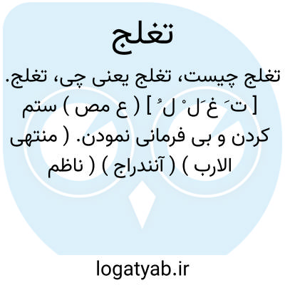لغت نامه دهخدا تغلج. [ ت َ غ َل ْ ل ُ ] ( ع مص ) ستم کردن و بی فرمانی نمودن. ( منتهی الارب ) ( آنندراج ) ( ناظم الاطباء ) ( از اقرب الموارد ). || آب خوردن خر، و زبان در دهن گردانیدن آن. ( منتهی الارب ) ( آنندراج ) ( ناظم الاطباء ).