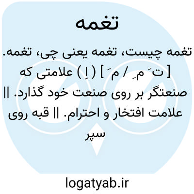 تغمه. [ ت َ م ِ / م َ ] ( اِ ) علامتی که صنعتگر بر روی صنعت خود گذارد. || علامت افتخار و احترام. || قبه روی سپر و مدال. ( ناظم الاطباء ).