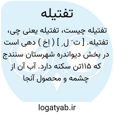 لغت نامه دهخدا تفتیله. [ ت َ ل ِ ] ( اِخ ) دهی است در بخش دیواندره شهرستان سنندج که 115تن سکنه دارد. آب آن از چشمه و محصول آنجا غله و توتون و لبنیات است. ( از فرهنگ جغرافیایی ایران ج 5 ).