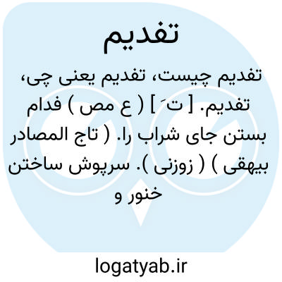 تفدیم. [ ت َ ] ( ع مص ) فدام بستن جای شراب را. ( تاج المصادر بیهقی ) ( زوزنی ). سرپوش ساختن خنور و جز آن را و سرپوش نهادن بر ابریق. ( منتهی الارب ) ( آنندراج ) ( ناظم الاطباء ) ( از اقرب الموارد ). || دهان بند بردهان نهادن. ( منتهی الارب ) ( آنندراج ) ( ناظم الاطباء ).دهان بند بر دهان گذاشتن مجوس. ( از اقرب الموارد ).