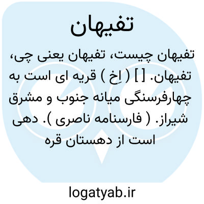 تفیهان. [ ] ( اِخ ) قریه ای است به چهارفرسنگی میانه جنوب و مشرق شیراز. ( فارسنامه ناصری ). دهی است از دهستان قره باغ بخش مرکزی شهرستان شیراز که 391 تن سکنه دارد. ( از فرهنگ جغرافیایی ایران ج 7 ).