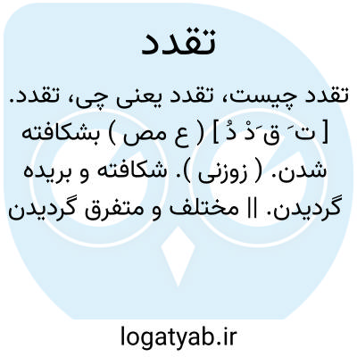 تقدد. [ ت َ ق َدْ دُ ] ( ع مص ) بشکافته شدن. ( زوزنی ). شکافته و بریده گردیدن. || مختلف و متفرق گردیدن قوم. ( منتهی الارب ) ( آنندراج ) ( ناظم الاطباء ). پراکنده شدن. ( تاج المصادر بیهقی ) ( زوزنی ). پراکنده شدن قوم و دارای امیال و آراء مختلف گردیدن آنان. ( از اقرب الموارد ). || خشک شدن هر چیزی. ( منتهی الارب ) ( آنندراج ) ( ناظم الاطباء ) ( از اقرب الموارد ). || پاره شدن جامه. ( منتهی الارب ) ( آنندراج ) ( ناظم الاطباء ). پاره و کهنه شدن جامه. ( از اقرب الموارد ). || بهزال درآمدن ناقه یا لاغر بوده فربه شدن گرفتن. ( منتهی الارب ) ( آنندراج ) ( ناظم الاطباء ) ( از اقرب الموارد ).