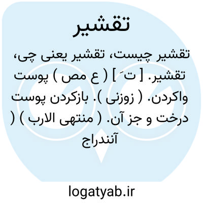 تقشیر. [ ت َ ] ( ع مص ) پوست واکردن. ( زوزنی ). بازکردن پوست درخت و جز آن. ( منتهی الارب ) ( آنندراج ) ( ناظم الاطباء ). پوست دور کردن از حبوب و میوه و غیره. ( غیاث اللغات ). پوست بازکردن از چوب و درخت و میوه و مانند آن. ( آنندراج ). قشر.تقشر. انقشار. ( اقرب الموارد ). رجوع به تقشر شود.