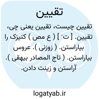تقیین. [ ت َ ] ( ع مص ) کنیزک را بیاراستن. ( زوزنی ). عروس بیاراستن. ( تاج المصادر بیهقی ). آراستن و زینت دادن. ( منتهی الارب ) ( آنندراج ) ( ناظم الاطباء ) ( از اقرب الموارد ).