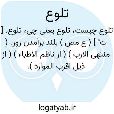 تلوع. [ ت ُ ] ( ع مص ) بلند برآمدن روز. ( منتهی الارب ) ( از ناظم الاطباء ) ( از ذیل اقرب الموارد ). || منبسطگردیدن چاشتگاه. ( منتهی الارب ) ( ناظم الاطباء ) ( از ذیل اقرب الموارد ). یقال: تلعت الضحی تلوعاً؛ اذا انبسطت. ( از ذیل اقرب الموارد ). || سر برآوردن مرد از هر چه که در او بود. || سر برآوردن گاو از جای باش خود. ( منتهی الارب ) ( ناظم الاطباء ).