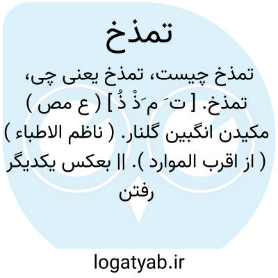 تمذخ. [ ت َ م َذْ ذُ ] ( ع مص ) مکیدن انگبین گلنار. ( ناظم الاطباء ) ( از اقرب الموارد ). || بعکس یکدیگر رفتن مرد و شتر در سیر. ( از اقرب الموارد ). || مانند مار رفتن ماده شتر. ( ناظم الاطباء ). || تکبر کردن مرد. ( ناظم الاطباء ).