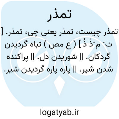 تمذر. [ ت َ م َذْ ذُ ] ( ع مص ) تباه گردیدن گردکان. || شوریدن دل. || پراکنده شدن شیر. || پاره پاره گردیدن شیر. ( منتهی الارب ) ( ناظم الاطباء ) ( آنندراج ) ( از اقرب الموارد ).