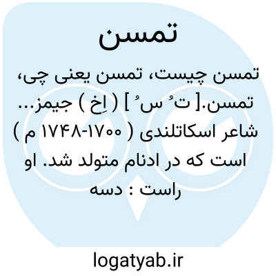 تمسن. [ ت ُ س ُ ] ( اِخ ) جیمز... شاعر اسکاتلندی ( 1834-1882 م. ) است وی در بندرگلاسگون متولد شد اشعارش محتوی بدبینی و یأس است.