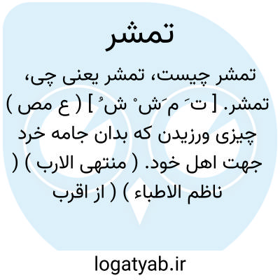 تمشر. [ ت َ م َش ْ ش ُ ] ( ع مص ) چیزی ورزیدن که بدان جامه خرد جهت اهل خود. ( منتهی الارب ) ( ناظم الاطباء ) ( از اقرب الموارد ). || برگ و شاخ برآوردن درخت. || اثر توانگری پیدا شدن بر کسی. ( منتهی الارب ) ( آنندراج ) ( ناظم الاطباء ) ( از اقرب الموارد ). || بی نیاز شدن. ( از اقرب الموارد ). || سبز شدن برگ. || جامه پوشیدن مردم. ( منتهی الارب ) ( ناظم الاطباء ) ( از اقرب الموارد ).