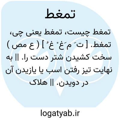تمغط. [ ت َ م َغ ْ غ ُ ] ( ع مص ) سخت کشیدن شتر دست را. || به نهایت تیز رفتن اسب یا یازیدن آن در دویدن. || هلاک کردن غبار کسی را. ( منتهی الارب ) ( آنندراج ) ( ناظم الاطباء ) ( از اقرب الموارد ). سقط البیت علیه فتمغط؛ فمات. ابن درید گوید که این مستعمل نیست. ( از اقرب الموارد ). || تمغیط. تمدید. تمدد. ( اقرب الموارد ).