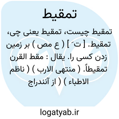 تمقیط. [ ت َ ] ( ع مص ) بر زمین زدن کسی را. یقال: مقط القرن تمقیطاً. ( منتهی الارب ) ( ناظم الاطباء ) ( از آنندراج ) ( از اقرب الموارد ). || به ریسمان کشیدن شتر. ( از اقرب الموارد ).