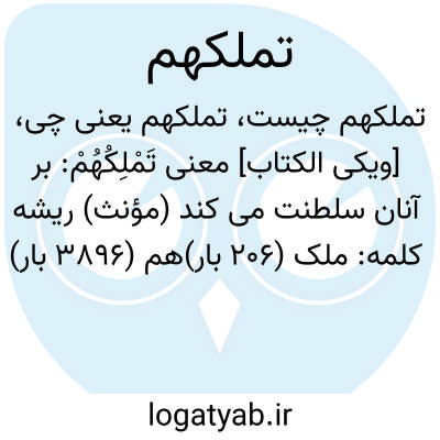 دانشنامه اسلامی [ویکی الکتاب] معنی تَمْلِکُهُمْ: بر آنان سلطنت می کند (مؤنث)ریشه کلمه: ملک (۲۰۶ بار)هم (۳۸۹۶ بار)
