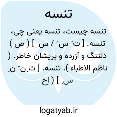 تنسه. [ ت َ س َ / س ِ ] ( ص ) دلتنگ و آزرده و پریشان خاطر. ( ناظم الاطباء ).