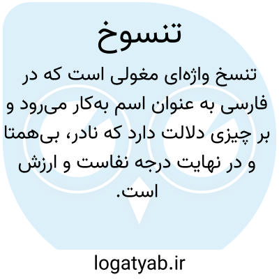 واژهٔ تنسخ واژه‌ای مغولی است که در فارسی به عنوان اسم به‌کار می‌رود و بر چیزی دلالت دارد که نادر، بی‌همتا و در نهایت درجهٔ نفاست و ارزش است. این واژه در منابع معتبر لغوی همچون فرهنگ جهانگیری، برهان قاطع، فرهنگ رشیدی، ناظم‌الاطباء، انجمن آرا و آنندراج آمده است و در همهٔ آن‌ها مفهومی واحد یعنی «شیء گرانبها و بی‌همانند» را بیان می‌کند. همچنین صورت عربی‌شدهٔ این واژه تنسوق ذکر شده است.