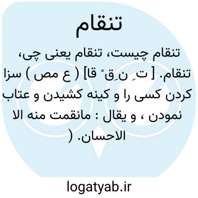 تنقام. [ ت ِ ن ِق ْ قا] ( ع مص ) سزا کردن کسی را و کینه کشیدن و عتاب نمودن، و یقال: مانقمت منه الا الاحسان. ( منتهی الارب ). عقوبت کردن کسی را. ( از اقرب الموارد ). || ناپسند داشتن امر را. ( منتهی الارب ). ناپسند داشتن و عیب کردن امری. ( از اقرب الموارد ). رجوع به نقم شود.