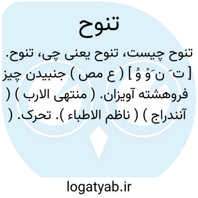 تنوح. [ ت َ ن َوْ وُ ] ( ع مص ) جنبیدن چیز فروهشته آویزان. ( منتهی الارب ) ( آنندراج ) ( ناظم الاطباء ). تحرک. ( اقرب الموارد ).
