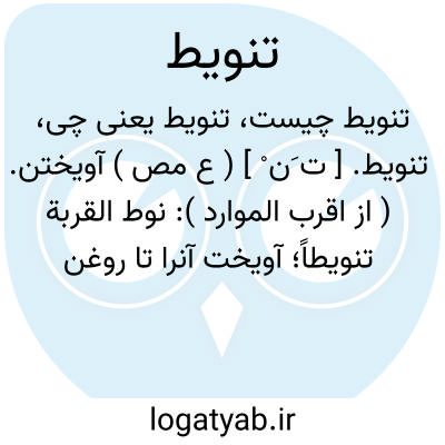 تنویط. [ ت َن ْ ] ( ع مص ) آویختن. ( از اقرب الموارد ): نوط القربة تنویطاً؛ آویخت آنرا تا روغن مالد. ( منتهی الارب ) ( از آنندراج ) ( ناظم الاطباء ).اثقال مَشک برای مالیدن روغن. ( از اقرب الموارد ).