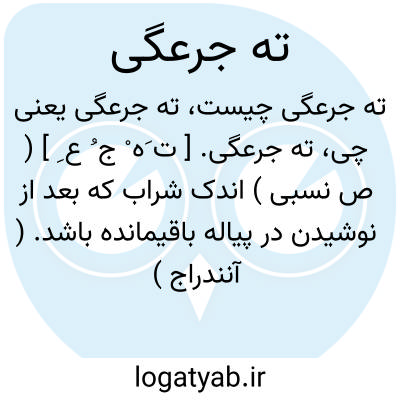 ته جرعگی. [ ت َه ْ ج ُ ع ِ ] ( ص نسبی ) اندک شراب که بعد از نوشیدن در پیاله باقیمانده باشد. ( آنندراج ) ( غیاث اللغات ). ته جرعه. رجوع به ته و دیگر ترکیبهای آن شود.