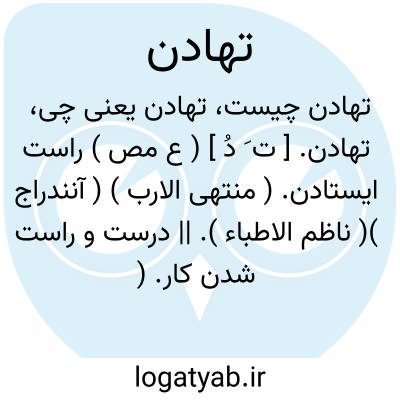 تهادن. [ ت َ دُ ] ( ع مص ) راست ایستادن. ( منتهی الارب ) ( آنندراج )( ناظم الاطباء ). || درست و راست شدن کار. ( منتهی الارب ) ( آنندراج ) ( ناظم الاطباء ) ( از اقرب الموارد ). || تصالح قوم. ( از اقرب الموارد ).