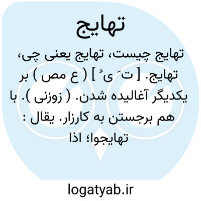 تهایج. [ ت َ ی ُ ] ( ع مص ) بر یکدیگر آغالیده شدن. ( زوزنی ). با هم برجستن به کارزار. یقال: تهایجوا؛ اذا تواثبو اللقتال و تحرکوا. ( منتهی الارب ) ( ناظم الاطباء ) ( از آنندراج ) ( از اقرب الموارد ).