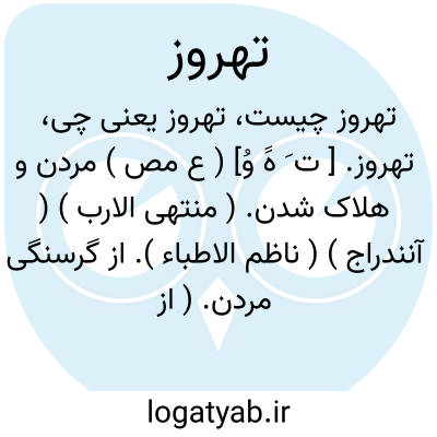 تهروز. [ ت َ هََ وُ] ( ع مص ) مردن و هلاک شدن. ( منتهی الارب ) ( آنندراج ) ( ناظم الاطباء ). از گرسنگی مردن. ( از اقرب الموارد ).