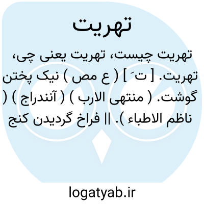 تهریت. [ ت َ ] ( ع مص ) نیک پختن گوشت. ( منتهی الارب ) ( آنندراج ) ( ناظم الاطباء ). || فراخ گردیدن کنج دهان. و از بعض عرب: علمهم الرجز یهرت اشداقهم. ( از اقرب الموارد ).