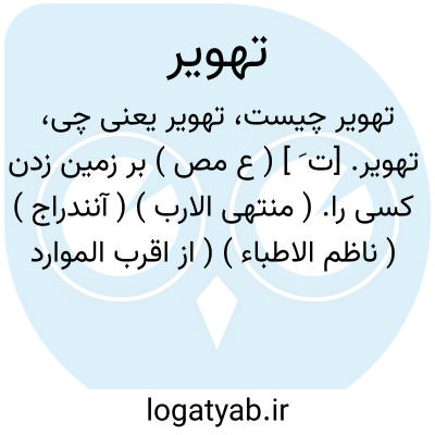 لغت نامه دهخدا تهویر. [ت َ ] ( ع مص ) بر زمین زدن کسی را. ( منتهی الارب ) ( آنندراج ) ( ناظم الاطباء ) ( از اقرب الموارد ). افگندن دیوار و جز آن. ( منتهی الارب ) ( آنندراج ) ( ناظم الاطباء ).
