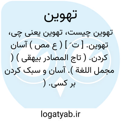 تهوین. [ ت َ ] ( ع مص ) آسان کردن. ( تاج المصادر بیهقی ) ( مجمل اللغة ). آسان و سبک کردن بر کسی. ( منتهی الارب ) ( آنندراج ) ( ناظم الاطباء ) ( از صراح اللغة ) ( از اقرب الموارد ). یقال: هون علیک؛ ای خفف و لاتبال. ( اقرب الموارد ). || سبک داشتن. ( منتهی الارب ) ( آنندراج ) ( ناظم الاطباء ) ( از اقرب الموارد ). || حقیر و هیچ شمردن. ( منتهی الارب ) ( آنندراج ) ( ناظم الاطباء ).